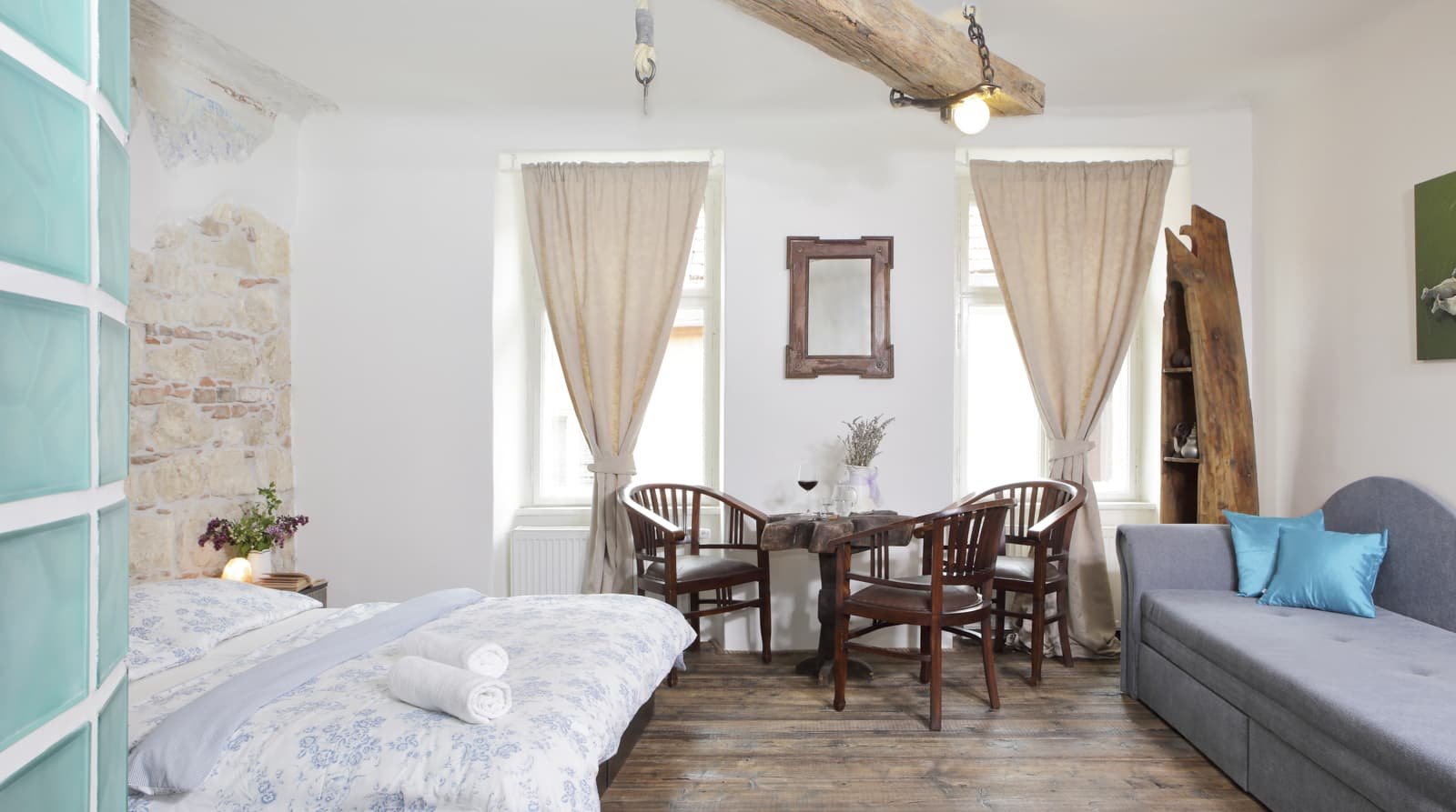 Stylově vybavené pokoje s pohodlnými postelemi, klimatizací a Wi-Fi pro Váš maximální komfort.